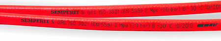 fortlaufend Inkjet, schwarze Schrift: "SEMPERIT (S) GAC ISO 3821 (EN 559) PN 2 MPa (20 bar) ID x OD -30°C YYYY MADE IN EU //////".