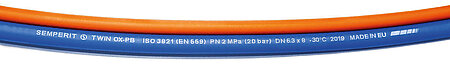 fortlaufend Inkjet auf blauem Schlauch, weiße Schrift: "SEMPERIT (S) TWIN OX-PB ISO 3821 (EN 559) PN 2 MPa (20 bar) ID x OD / ID x OD -30°C YYYY MADE IN EU //////".